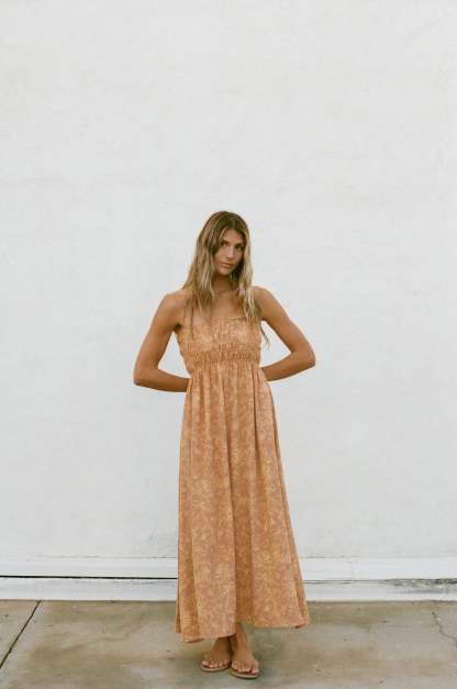 Meet the Sunrise Smocked Spaghetti Dress, which offers a beautiful print detail and a stretchy smocked chest fit. This midi length dress provides both style and comfort - a perfect addition to any wardrobe.